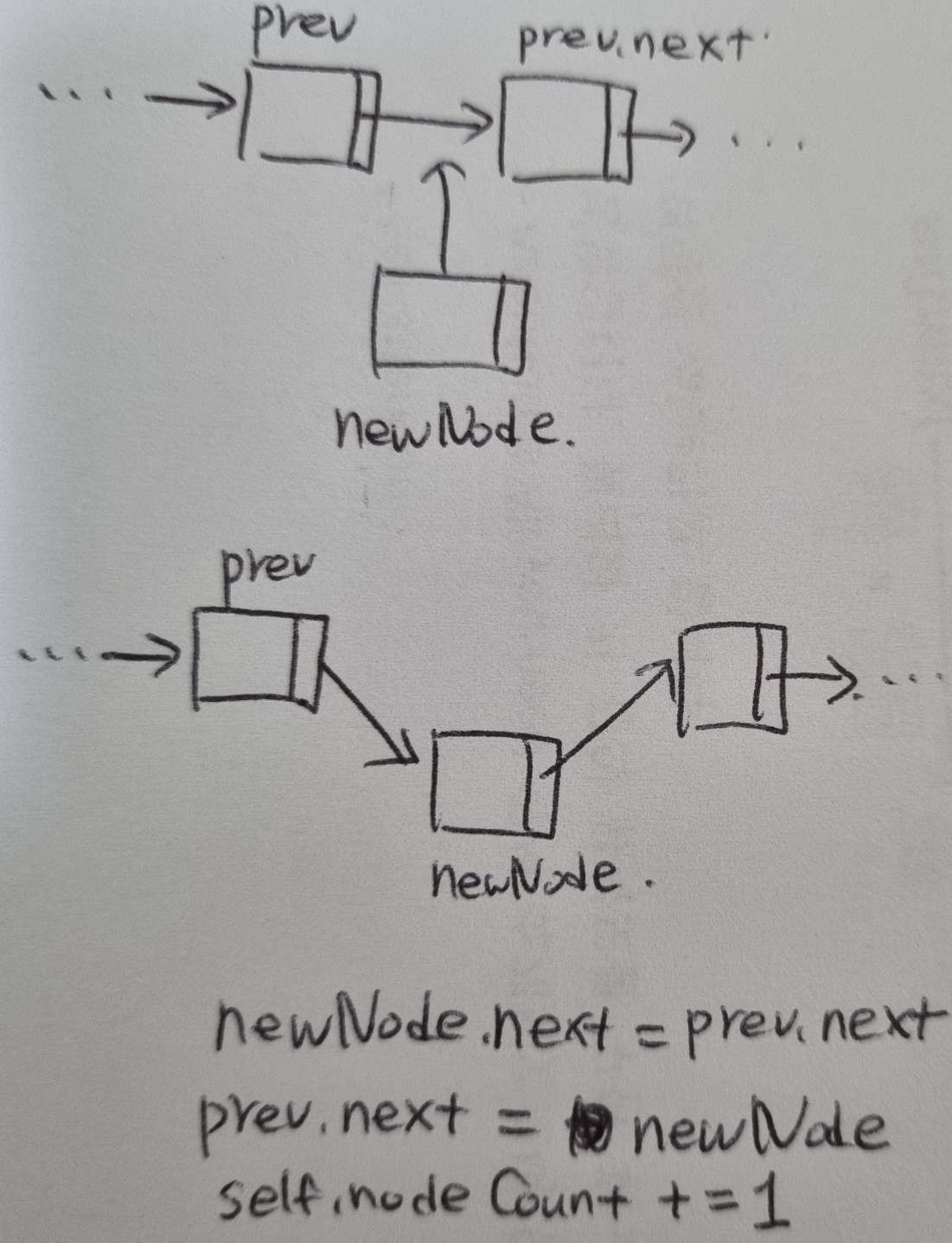아래와 같은 그림에서 prev와 prev.next 사이에 newNode를 삽입하는 모습이다.