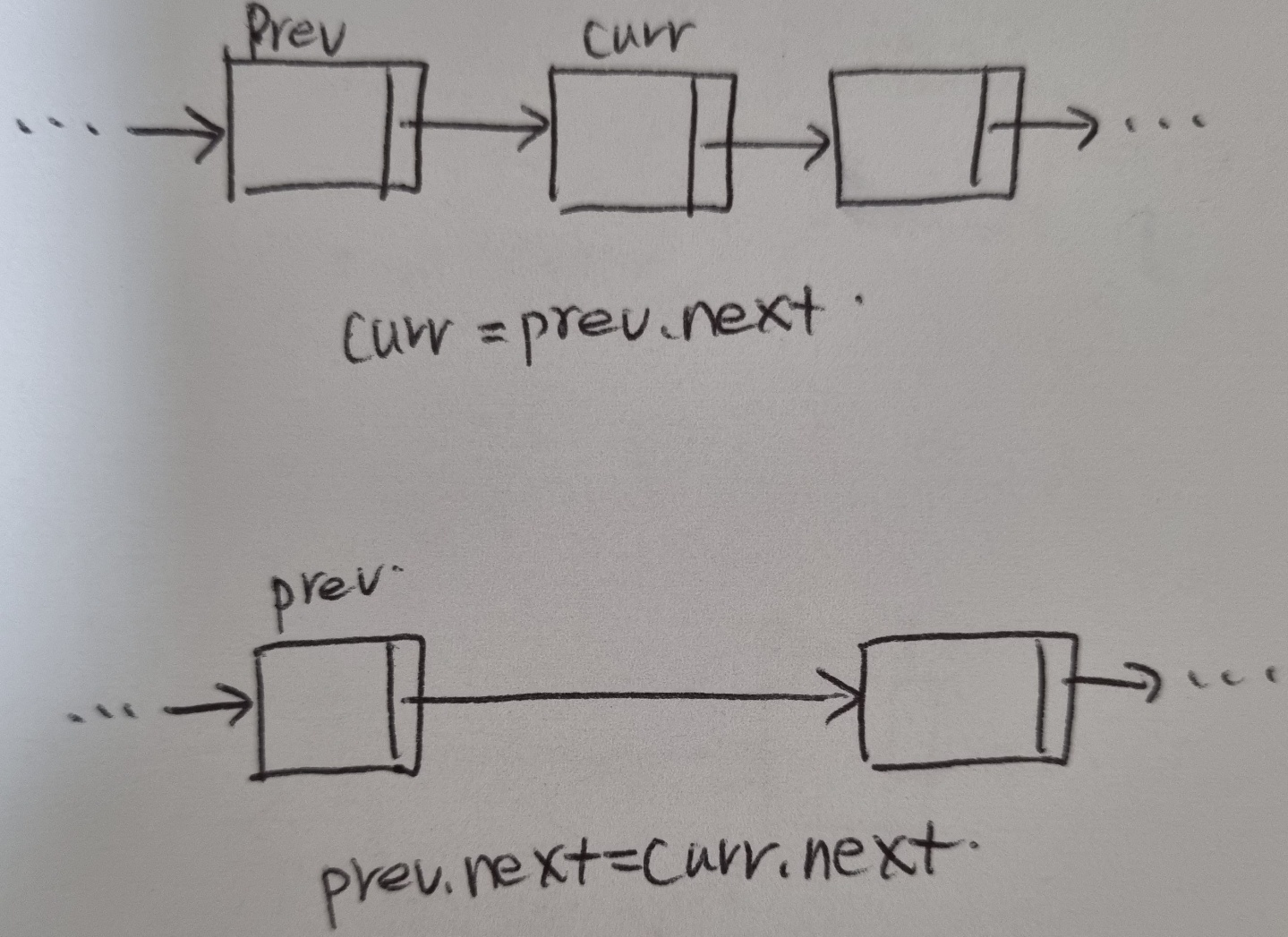 curr 노드를 삭제하여 prev.next가 curr.next를 가리키도록 조정한다.