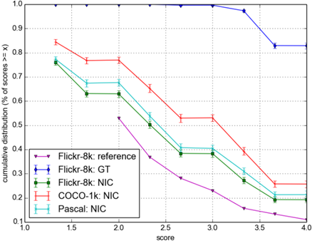 NIC가 다른 참조 모델들보다는 점수(사람이 평가한 점수)가 높지만 GT보다는 낮은 것을 알 수 있다. 그러나 4.3.2절에서는 BLEU 점수는 사람이 생성한 문장보다 NIC가 생성한 문장의 점수가 높았다. 그러므로 BLEU가 완벽한 메트릭이 아니라는 것을 보여준다.