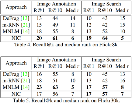 - 실험을 통해, 이미지 설명을 위한 데이터 셋이 클수록, NIC와 같은 접근법의 성능이 증가함