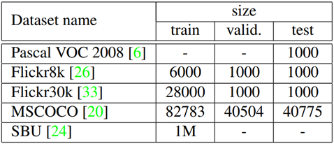SBU 데이터를 제외한 나머지 데이터는 5개의 문장이 라벨링되어 있다. SBU 데이터는 이미지 소유자가 Flickr에 업로드할 때 올린 설명으로 구성된다. 일종의 노이즈 역할을 하는 데이터로 생각하면 된다.