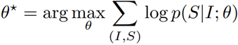모든 학습 데이터(I, S)에 대하여, 이미지(I)가 주어졌을 때 올바른 설명(S)의 확률을 최대화하는 모델의 파라미터(θ)를 찾는 것이 목표이다.