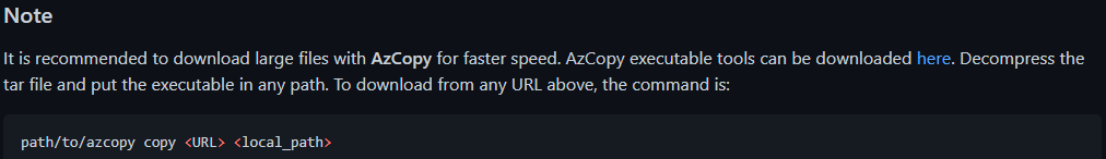 그래서 깃헙 설명 하단을 보니 azcopy를 이용해서 다운 받으라고 한다.