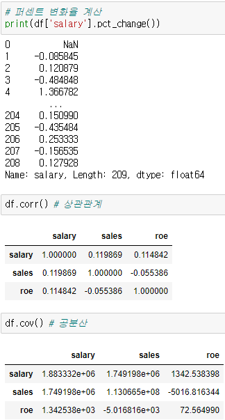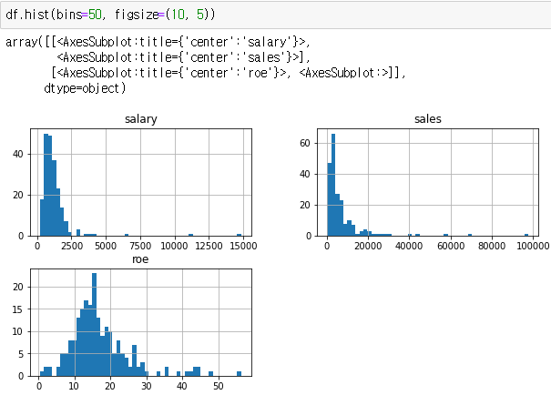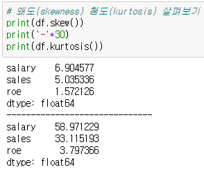 salary, sales는 mean과 중위수 간이 차이가 다소 크므로 이상치가 많다고 볼 수 있음 - 왜도(skewness) 첨도(kurtosis)