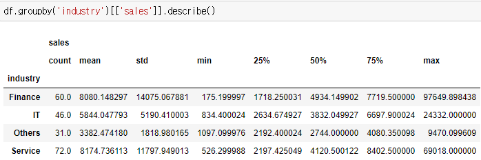 - industry 범주 별로 salary(종속변수)의 평균 및 기술 통계량을 파악하기 위해 groupby 함수 이용