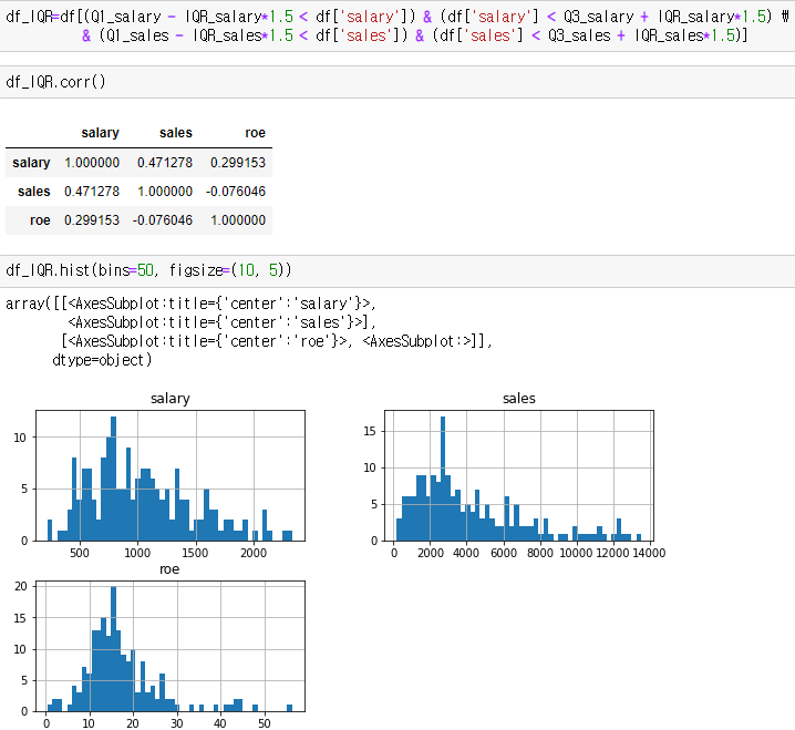 - 각 변수에 대한 이상치를 IQR을 통해 제거한 후 상관계수와 히스토그램 확인한 결과