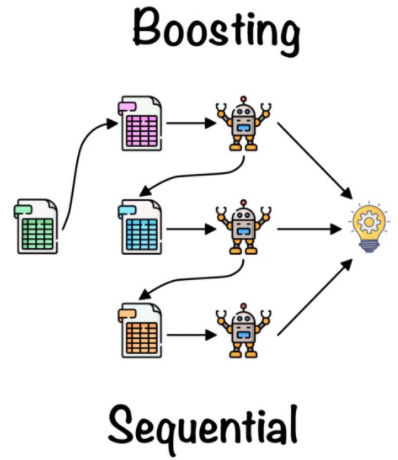 - 배깅이 한 번에 여러 개의 데이터셋에서 학습한 결과를 종합하는 병렬식 앙상블인 반면, 부스팅은 앞에서 학습한 모델 결과를 바탕으로 두 번째 모델에서 오류를 수정하고 세 번째 모델에서 또 오류에 중점을 두어 해결해 나가는 순차적인 직렬식 앙상블