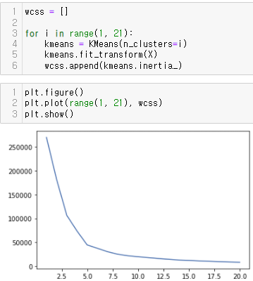 - 핵심은 군집수를 1~21개까지 늘려보면서 'kmeans.inertia_' 값을 살펴보는 것