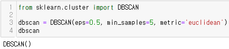 - eps(epsilon) : 근접 이웃점을 찾기 위해 정의 내려야 하는 반경 거리