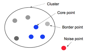 - Core point : epsilon 반경 내에 최소점(minPts) 이상을 갖는 점