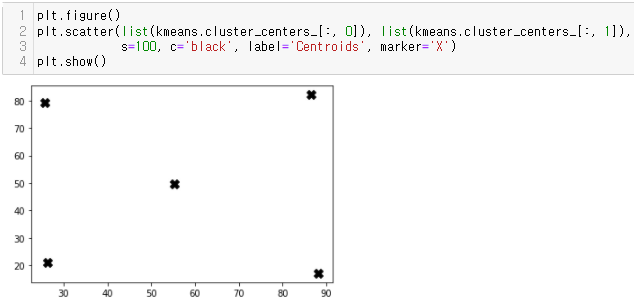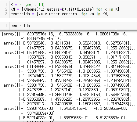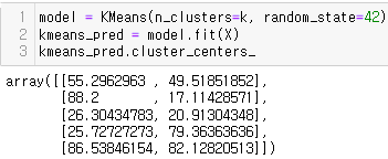 - 그 중 '.cluster_centers_'가 각 좌표의 중심점 결과가 담겨진 객체임