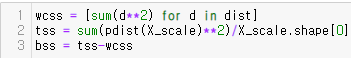 - 각 군집 내에 wcss는 개체들간의 거리를 제곱하여 더한 값임