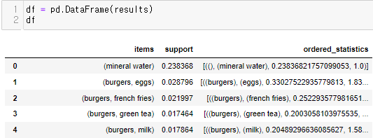 - 이러한 데이터를 바탕으로 연관규칙은 지지도(support), 신뢰도(confidence), 향상도(lift)를 구하고 두 개 이상의 동시 구매 발생의 규칙을 계산한 지표를 바탕으로 도출해 냄