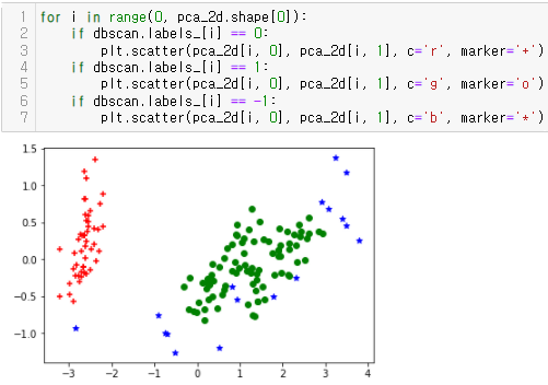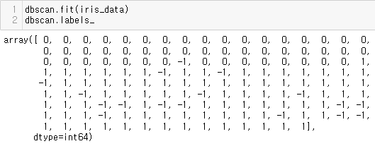 - dbscan 모델에 iris_data를 학습(fit) 시킨 후, dbscan.labels_를 확인