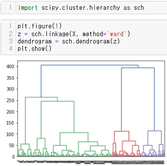 - 계층적 군집에서 개체들 간에 군집이 형성되는 과정을 파악하기 위해 sch 사용