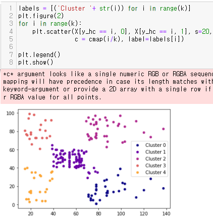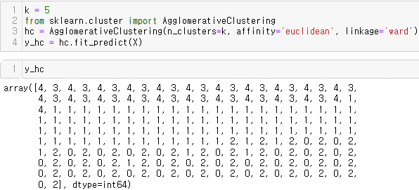 - 군집수를 5로 하여 병합군집(AgglomerativeClustering)을 적용한 군집분석 수행