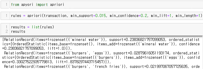 - 연관규칙은 Apriori Algorithm이라고 하며 대용량의 트랜잭션 데이터(거래 데이터)로부터 'X이면 Y이다'라는 형식의 연관관계를 발견하는 기법임
