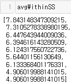 - avgWithinSS: 군집의 중심과 개체들 간의 최소 거리들의 평균을 구해 저장한 값