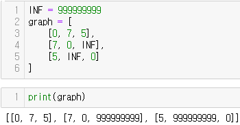 연결이 되어 있지 않은 노드끼리는 무한의 비용이라고 작성(실제 코드에서는 999999999 등의 값으로 초기화하는 경우가 많음)