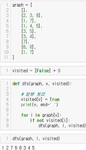 스택의 최상단 노드에 방문하지 않은 인접 노드가 있으면 그 인접 노드를 스택에 넣고 방문 처리를 함. 방문하지 않은 인접 노드가 없으면 스택에서 최상단 노드를 꺼냄 (방문 처리: 스택에 한 번 삽입되어 처리된 노드가 다시 삽입되지 않게 체크하는 것을 의미. 방문 처리를 함으로써 각 노드를 한 번씩만 처리할 수 있음)