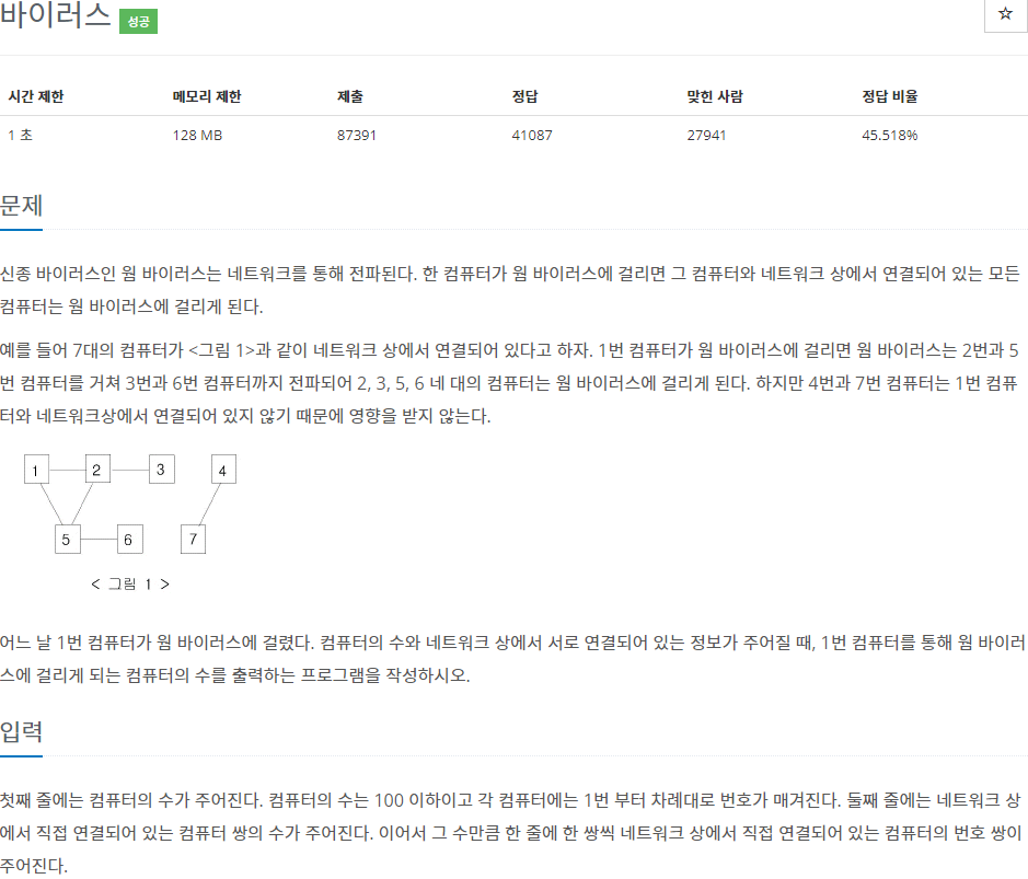n_computer = int(input()) # 컴퓨터의 수 n_connection = int(input()) # 연결의 수 # 빈 인접 행렬 생성 # 노드가 1부터 시작하므로 인덱스가 0인 경우 무시하고 1부터 시작하기 위해 +1 해줌 graph = [[] for _ in range(n_computer+1)] # 연결된 컴퓨터의 번호 쌍 입력 받기 for i in range(n_connection): idx, val = map(int, input().split()) # 인접 행렬 생성 graph[idx].append(val) graph[val].append(idx) visited = [False]*(n_computer+1) def dfs(visited, v, graph): visited[v] = True # 방문 표시 # 방문한 인덱스의 인접 리스트 접근 for i in graph[v]: # 방문하지 않은 경우 방문함 if visited[i] == False: dfs(visited, i, graph) return visited visited = dfs(visited, 1, graph) print(sum(visited[2:]))728x90반응형'Coding Test > 백준' 카테고리의 다른 글