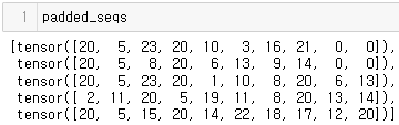 max_seq_len = 10 # 최대 길이 padded_seqs = [] # 새롭게 패딩 처리를 한 토큰을 담기 위한 list for tokens in encoded_sents: padding = max_seq_len - len(tokens) # 최대 길이와 각 시퀀스 길이의 차이 # 최대 길이(13)보다 작거나 같은 경우 if padding >= 0 : # 차이만큼 padding 처리 new_tokens = torch.cat(( torch.tensor(tokens), torch.zeros(padding, dtype=torch.int64) )) # 최대 길이(13)보다 큰 경우 else: # 최대 길이에 맞기 자름(truncate) tokens = tokens[:max_seq_len] new_tokens = torch.tensor(tokens) padded_seqs.append(new_tokens)