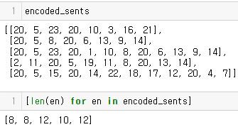 # 한 문장을 받아 vocab을 통해 인코딩하는 함수 def sent_encoding(sent, vocab): encoded_sent = [] for token in sent.split(' '): encoded_sent.append(vocab[token]) return encoded_sent encoded_sents = [] for sent in preprocessed_sents: encoded_sents.append(sent_encoding(sent, vocab))인코딩한 결과와 각 시퀀스의 길이를 살펴보자