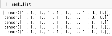 mask_list = [] for seq in padded_seqs: # ge(1) 함수는 seq에서 1보다 크거나 같은 토큰들은 True 1보다 작으면 False를 반환함 # 즉, padding 부분은 False로 나머지는 True로 됨 mask = seq.ge(1) mask = mask.float() # float()을 통해 padding 부분은 0 나머지는 1인 mask 생성 mask_list.append(mask)