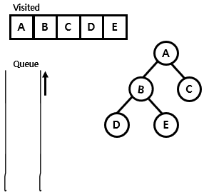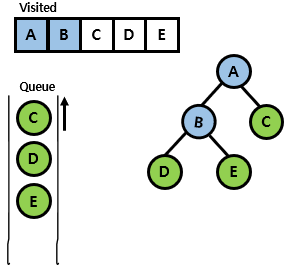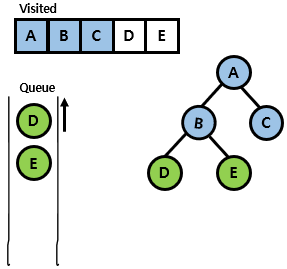 - B 노드를 visited 표시하고 B 노드의 방문하지 않은 adjacent 노드를 탐색함. 여기서는 D, E가 있으며 이를 queue에 enqueue함