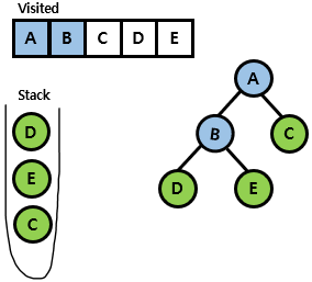 - stack의 가장 상단에 있는 B를 꺼내어 B 노드를 visited 표시하고 B 노드의 방문하지 않은 adjacent 노드를 탐색함. 여기서는 D, E가 있으며 이를 stack에 push함