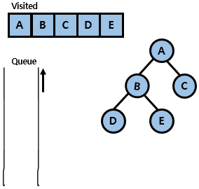 - A 노드를 visited 표시(blue)하고 A 노드의 방문하지 않은 adjacent 노드를 탐색함. 여기서는 B, C가 있으며 이를 queue에 enqueue함