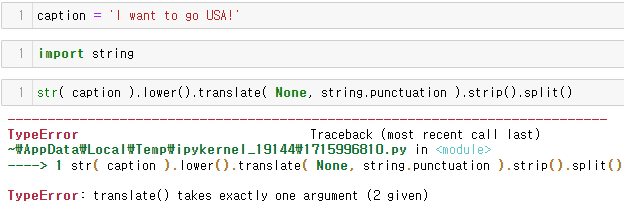 translate 안의 "None, string.punctuation" 부분을 "str.maketrans('','',string.punctuation)"로 변경하면 아래와 같이 Python 3에서 에러 없이 작동한다!